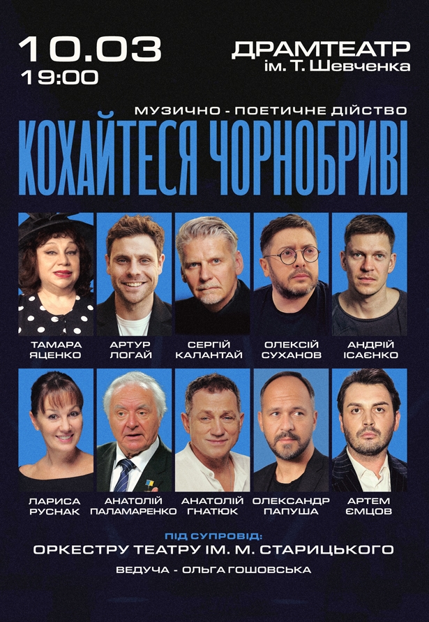 Кохайтеся Чорнобриві - музыкально-поэтическое действо состоится 10 марта 2026, 19:00, вторник в Театр им. Шевченко. С помощью сервиса internet-bilet.ua, Вы сможете с легкостью забронировать, заказать и купить билеты на интересующий Вас концерт, спектакль, оперу, балет, мастер-классы, спортивные и детские мероприятия, оплатив их самым удобным для Вас способом: через интернет банковской картой VISA/MasterCard, наличными или курьером, если сделаете заказ билета c доставкой.