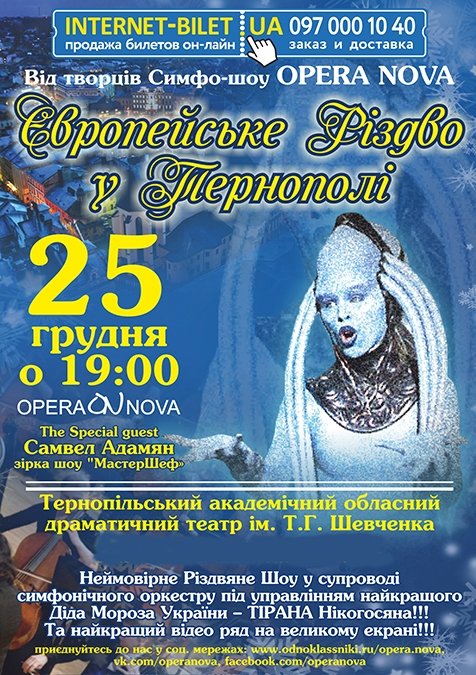 Європейське Різдво уТернополі відбудеться 25 грудня 2014, 19:00, четвер в Театр ім. Шевченка. За допомогою сервісу internet-bilet.ua, Ви зможете з легкістю забронювати, замовити та купити квитки на концерт, спектакль, оперу, балет, майстер-класи, спортивні та дитячі заходи, що Вас цікавлять, оплативши їх найбільш зручним для Вас способом: через інтернет банківською карткою VISA/MasterCard, готівкою або кур'єром, якщо зробите замовлення квитка з доставкою.