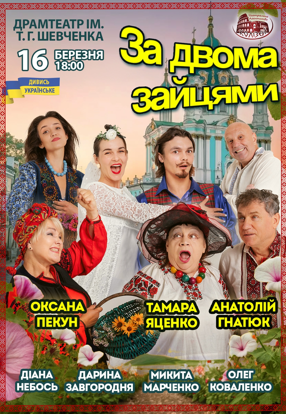 Вистава "За двома зайцями" відбудеться 16 березня 2026, 18:00, понеділок в Театр ім. Шевченка. За допомогою сервісу internet-bilet.ua, Ви зможете з легкістю забронювати, замовити та купити квитки на концерт, спектакль, оперу, балет, майстер-класи, спортивні та дитячі заходи, що Вас цікавлять, оплативши їх найбільш зручним для Вас способом: через інтернет банківською карткою VISA/MasterCard, готівкою або кур'єром, якщо зробите замовлення квитка з доставкою.